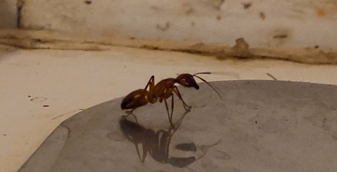 One night, after the day’s construction had disturbed the wet wood under the sink, I saw a strange ant on the countertop. Rather than running along a path, it stationed itself in a small area about the size of a silver dollar. I watched it for a minute, then three, then five, trying to make sense of its behavior. Periodically, it would flail wildly, as though it were a sentry attacking some invisible invader. After a moment, it would calm itself and rotate a fraction of a circle. Soon enough, the pattern would begin again. Later, I was told this was a queen carpenter ant.